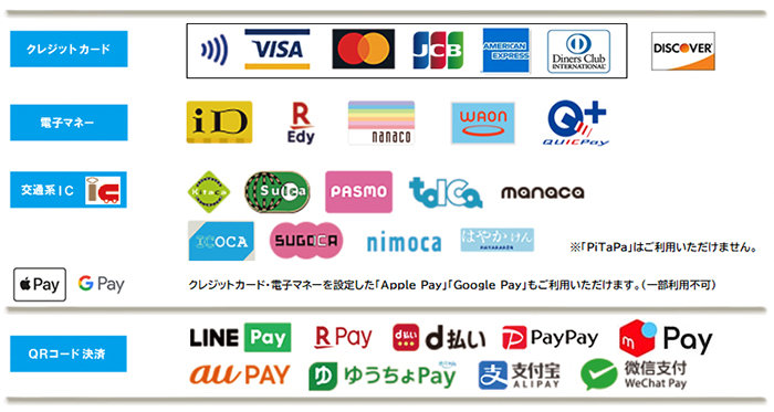 「クレジットカード」「電子マネー」「交通系IC」「QRコード決済」等、各種キャッシュレス決済をご利用ください。